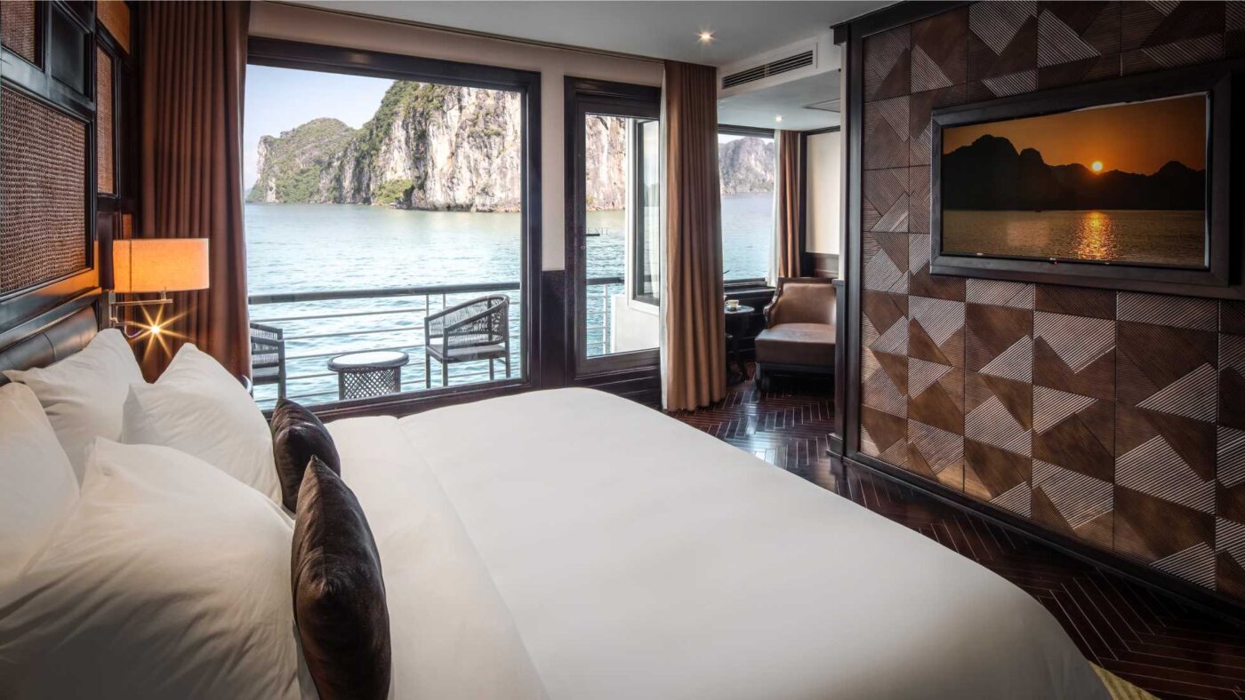 Private balconies with uninterrupted views of Halong Bay’s limestone karsts.