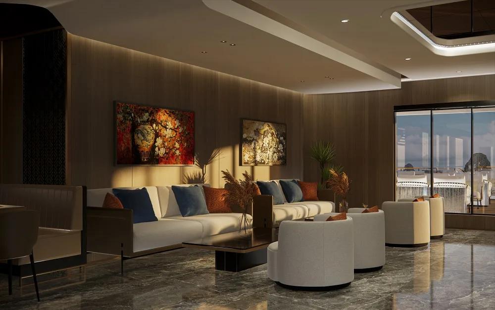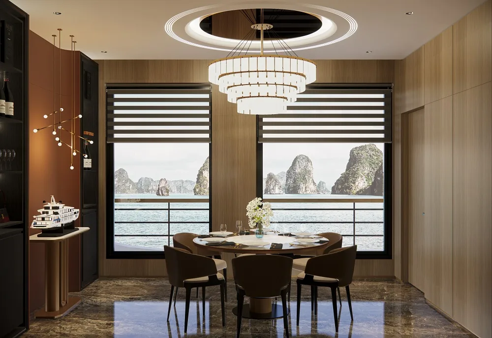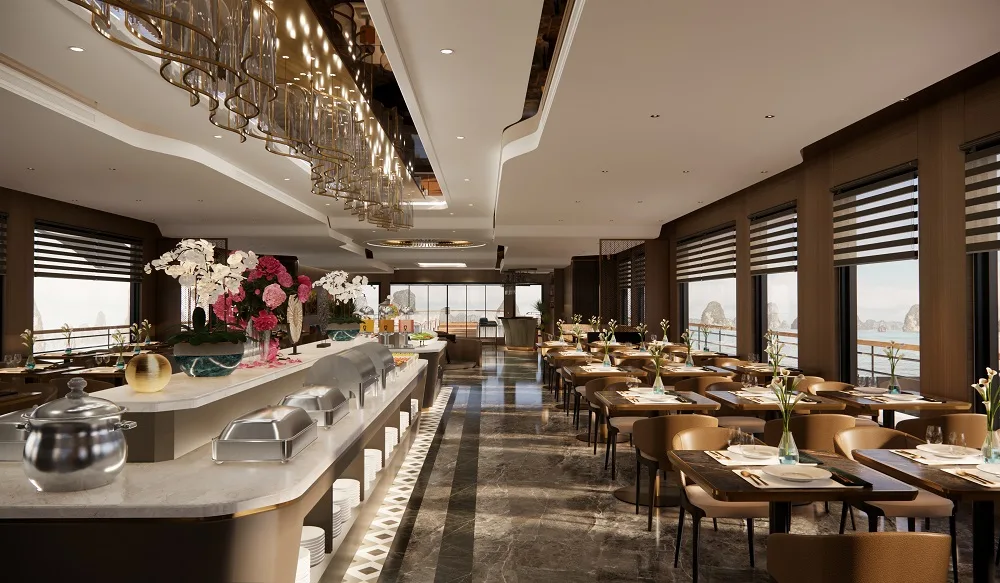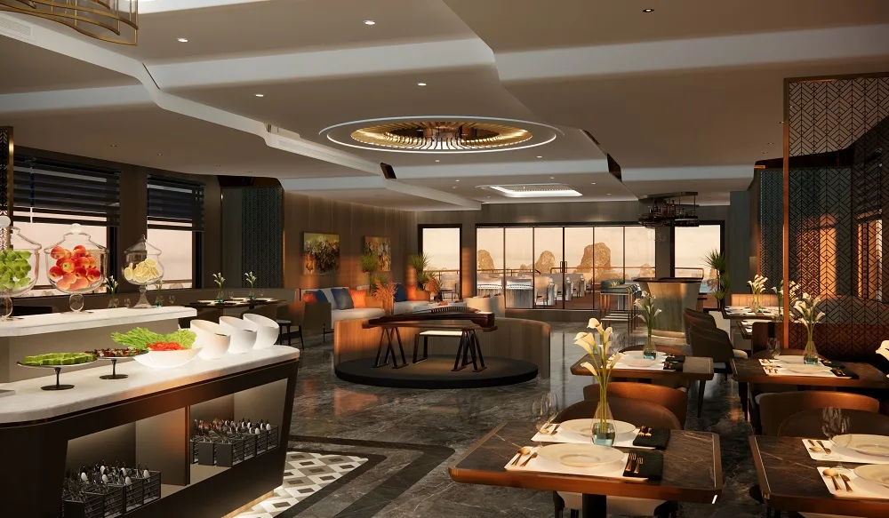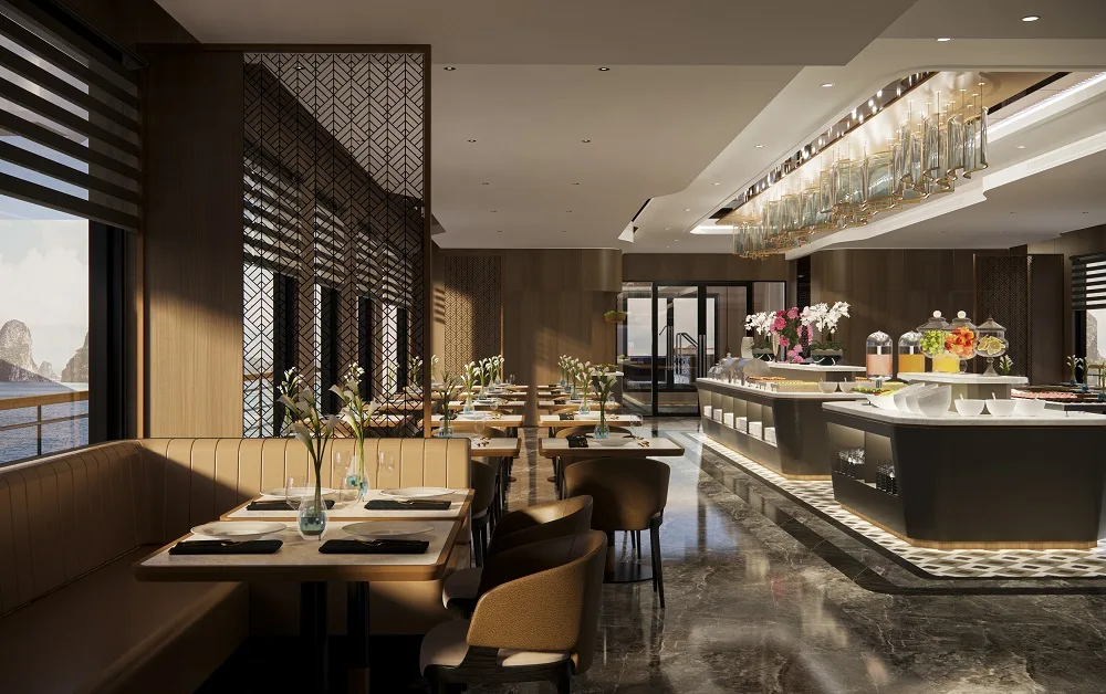 Located on the upper deck, our elegant restaurant features floor-to-ceiling glass windows, allowing guests to savor exquisite cuisine while overlooking the ever-changing scenery of the bay. Designed with a blend of modern elegance and Indochine charm, the atmosphere is warm, refined, and romantic.