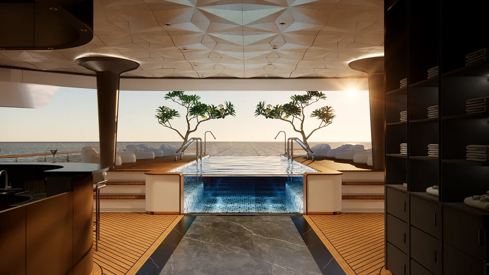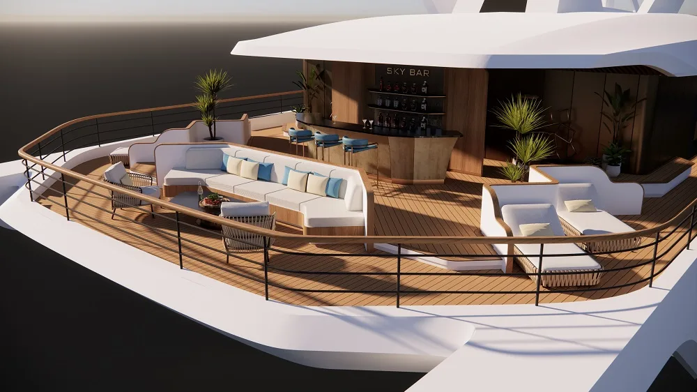 Royal Azura Suite | 45 m² | Upper Deck (Front / Bow) | 180° panoramic view with private jacuzzi balcony | Separate living area, jacuzzi tub, butler, private dining, champagne welcome | VIP guests or couples seeking the ultimate 6-star luxury |