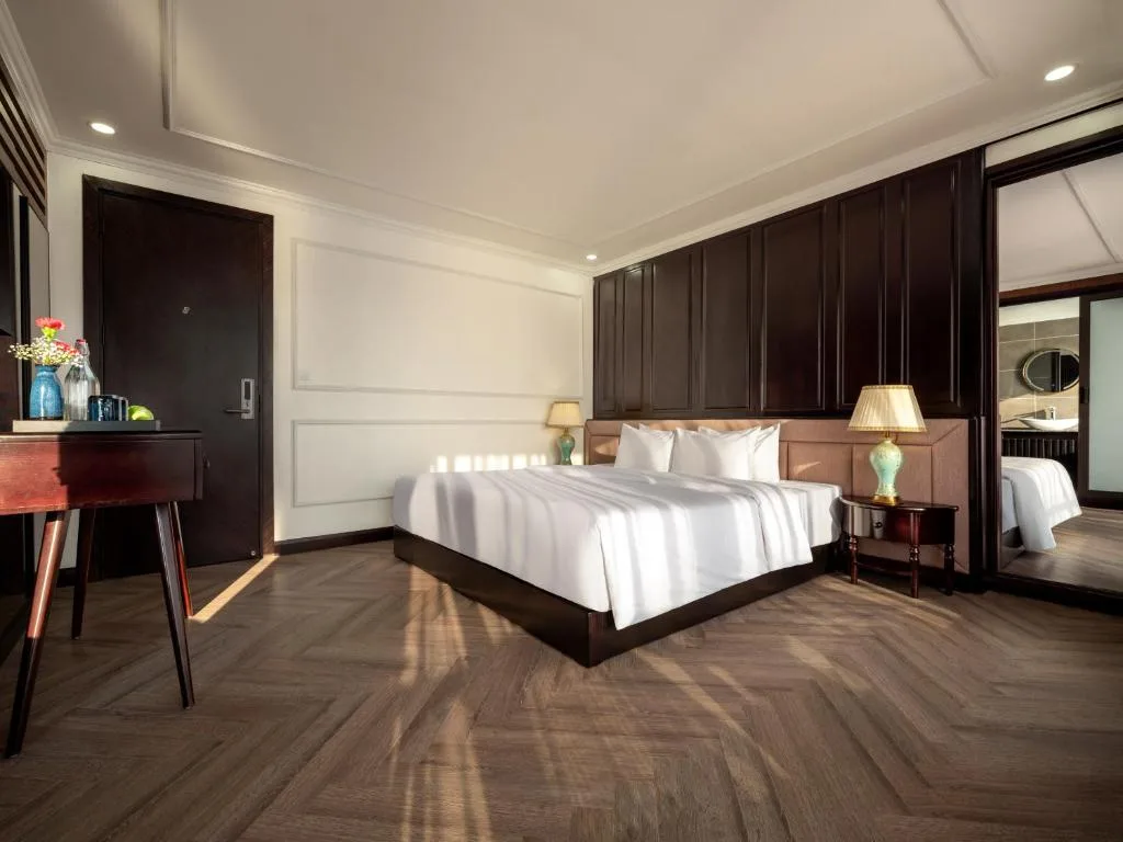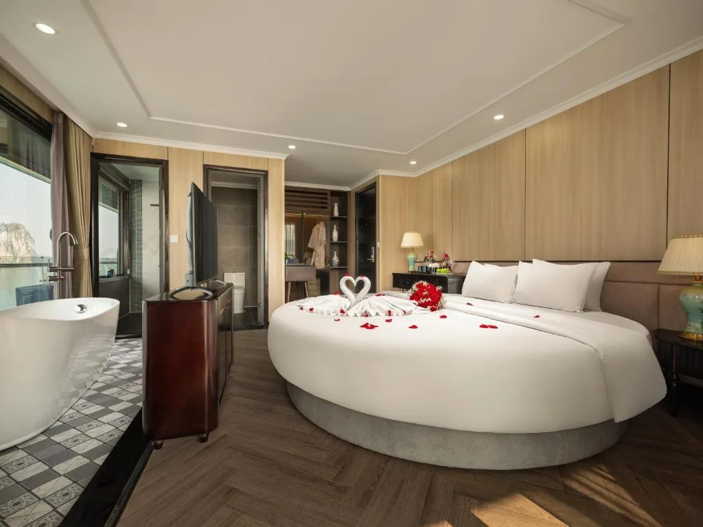 • Luxury cabins with balconies: Every room on this Halong Bay luxury cruise with balcony offers uninterrupted views of limestone karsts and emerald waters.