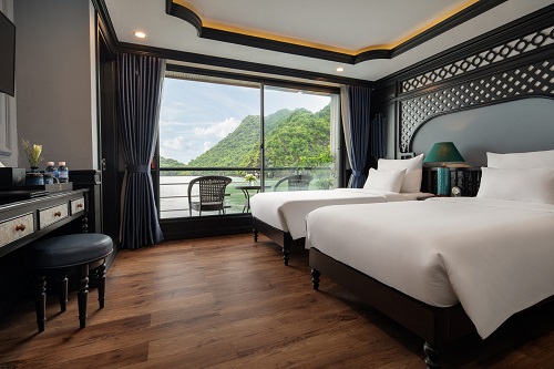 Located on the upper deck, these rooms offer floor-to-ceiling windows and unobstructed 180° views of Halong Bay’s limestone karsts.