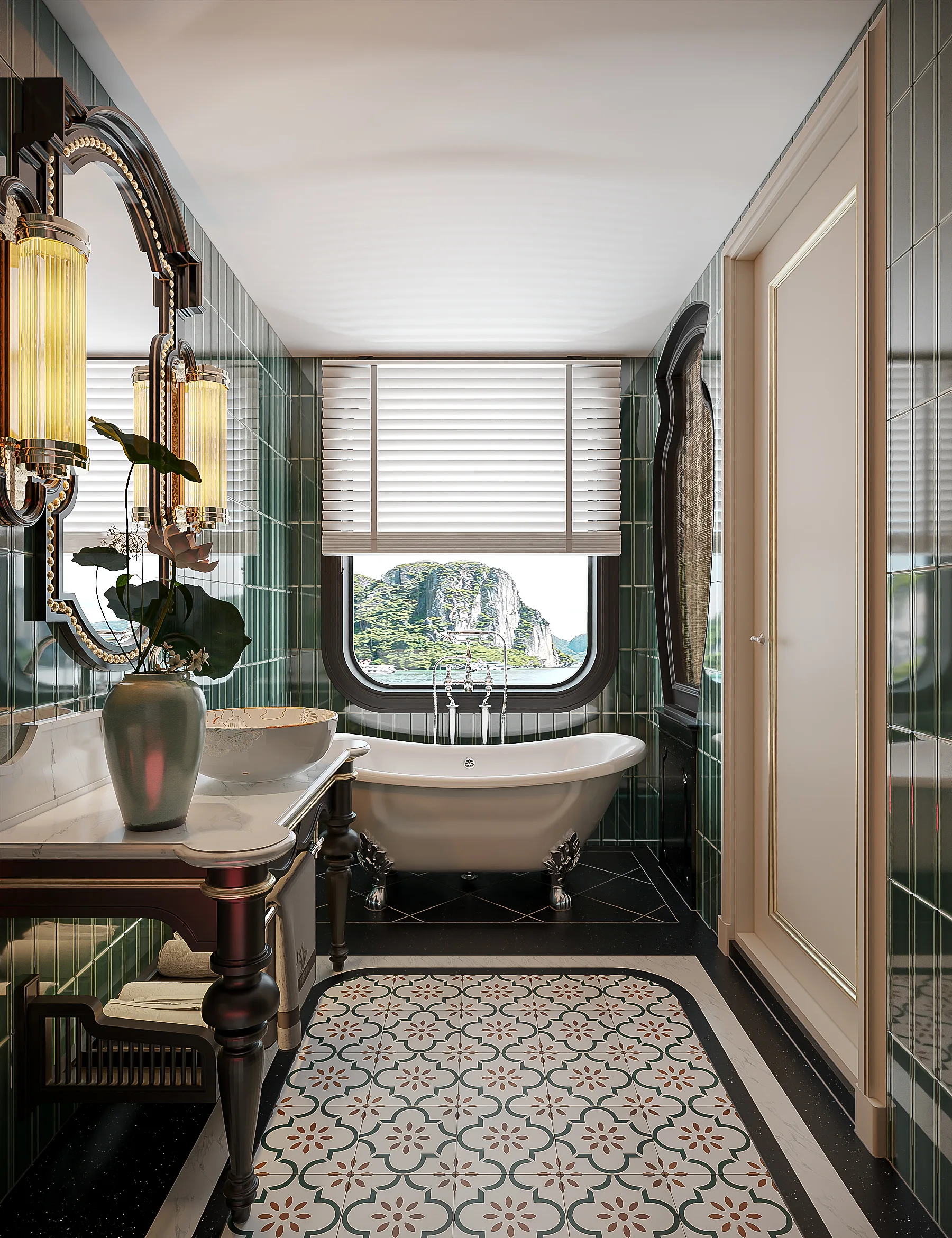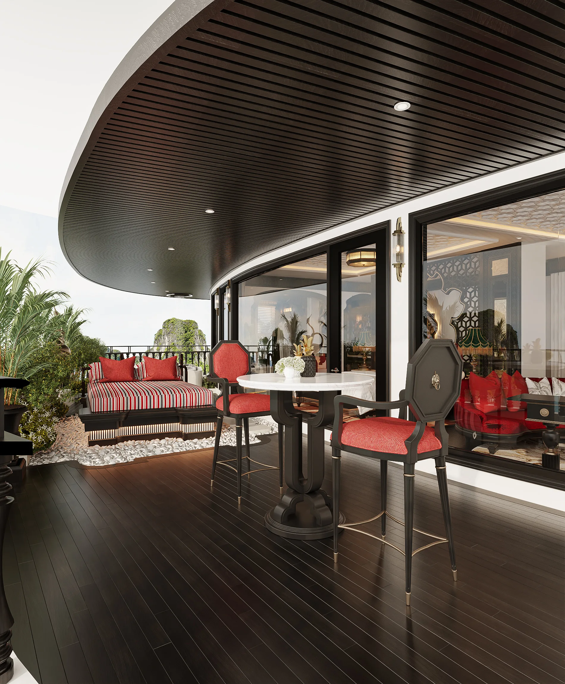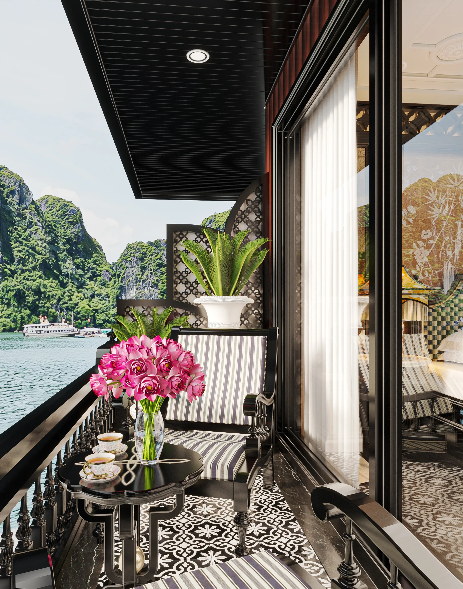 Private balcony suites offering uninterrupted views of limestone karsts and emerald waters.